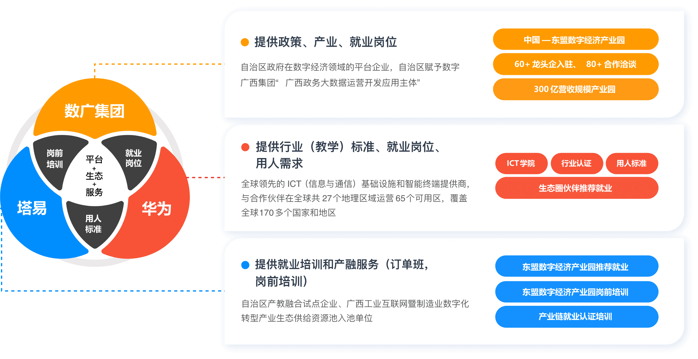 塔易技术与数广集团旗下中国-东盟数字经济产业园、华为技术有限公司等多家龙头企业合作,围绕各行业岗位标准,为职业院校提供岗前认证培训,完成人才输送等目标任务,重点培养广西急缺的数字经济领域人才,服务本地产业。