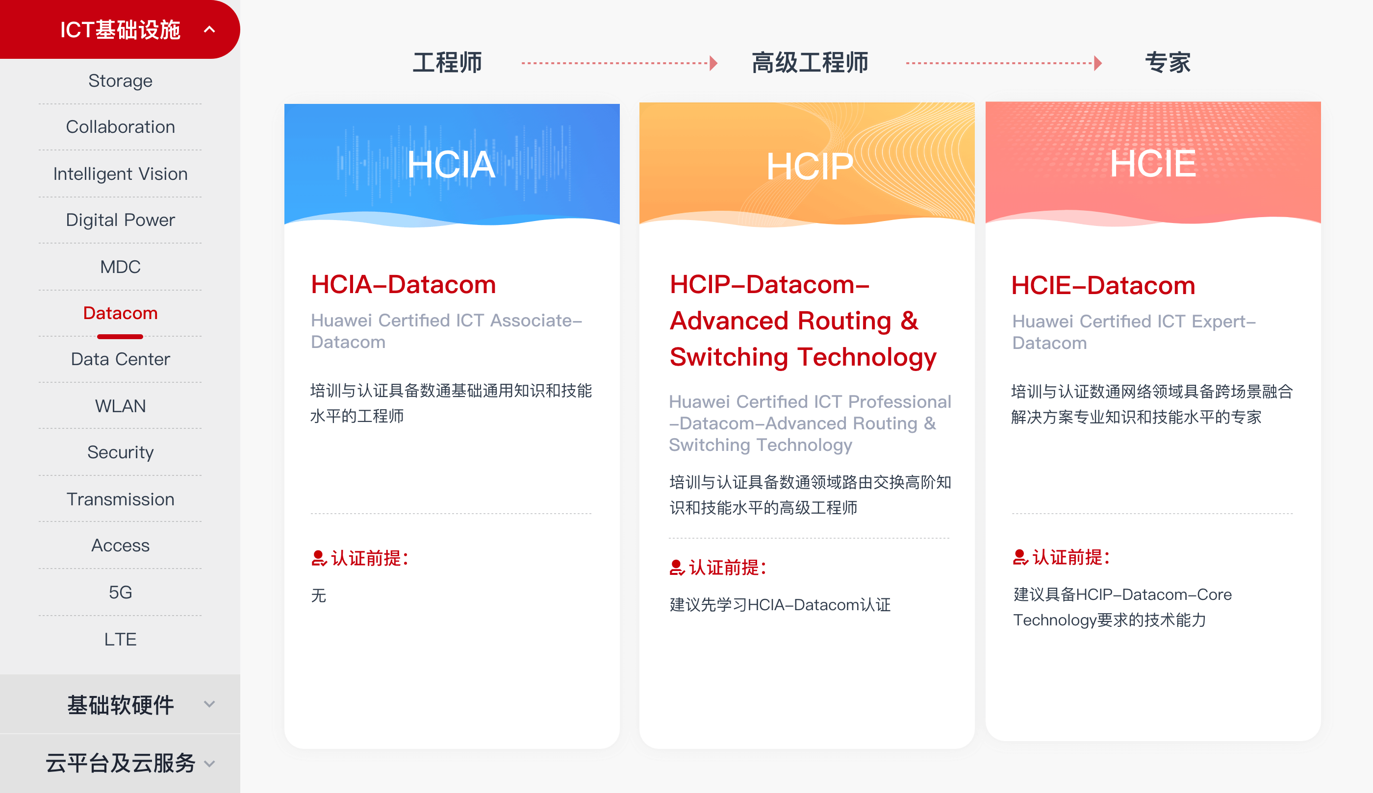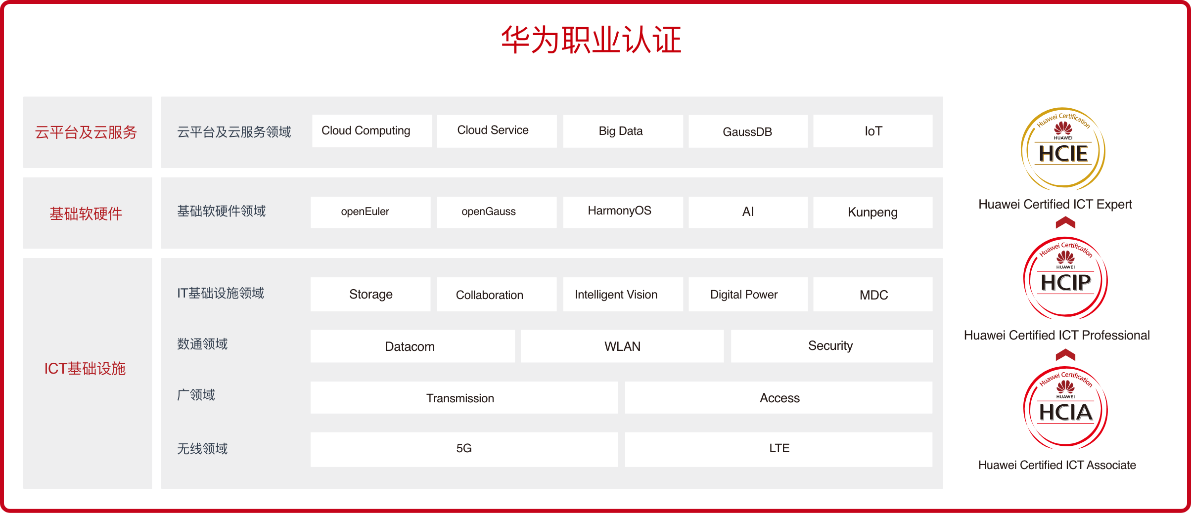 华为职业认证覆盖ICT全领域,致力于提供领先的人才培养体系和认证标准,培养数字化时代的新型ICT人才,构建良性的ICT人才生态。