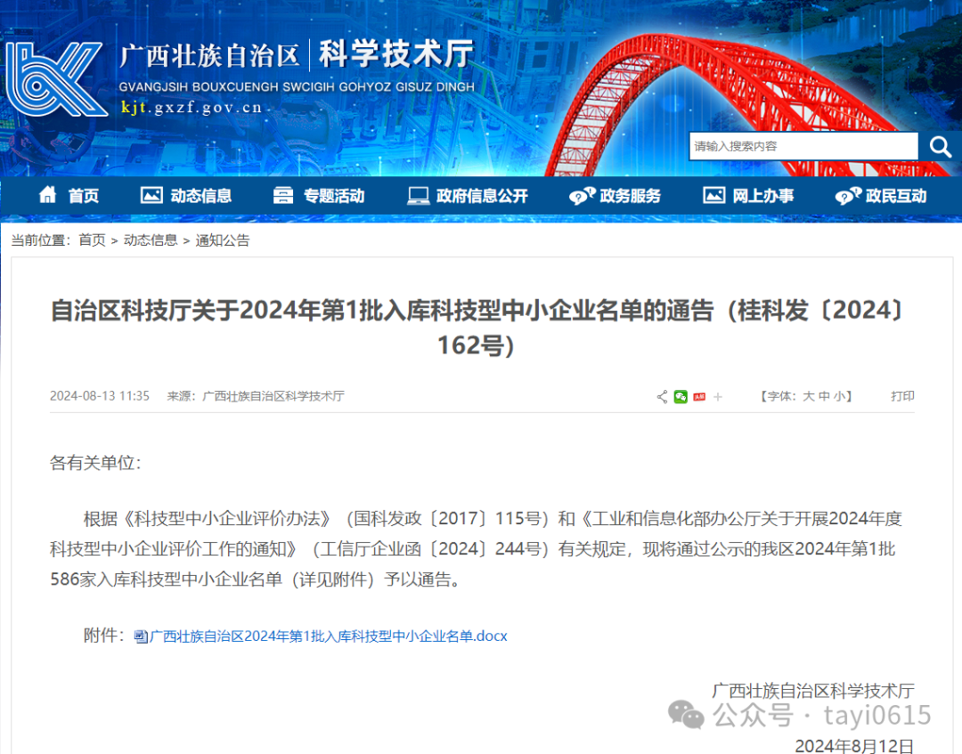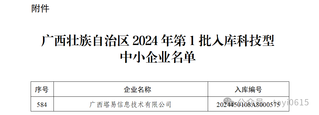 塔易技术成功入库广西2024年第1批科技型中小企业
