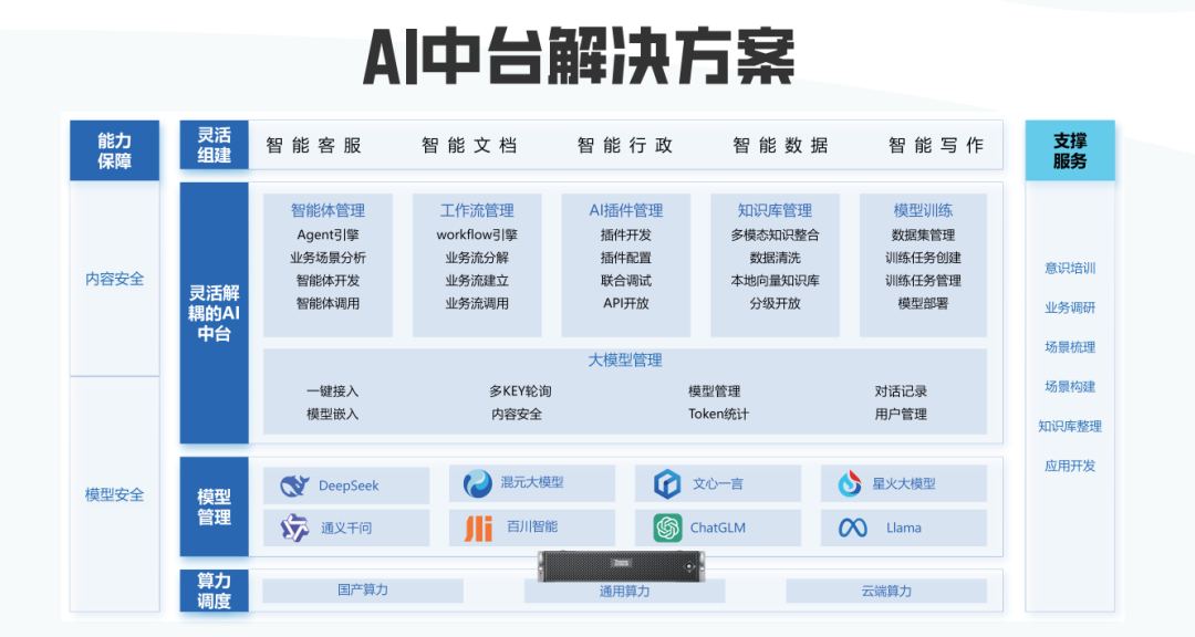 AI中台解决方案:支持文心一言、DeepSeek等主流大模型的统一调度与知识库管理,深度赋能智能课堂、学习伴侣及校园管家核心场景。平台同时支持从模型精调、数据对接到基于RLHF五阶段技术的训练支持,为教育专属模型提供底层能力,支持各类算力资源的调度。
