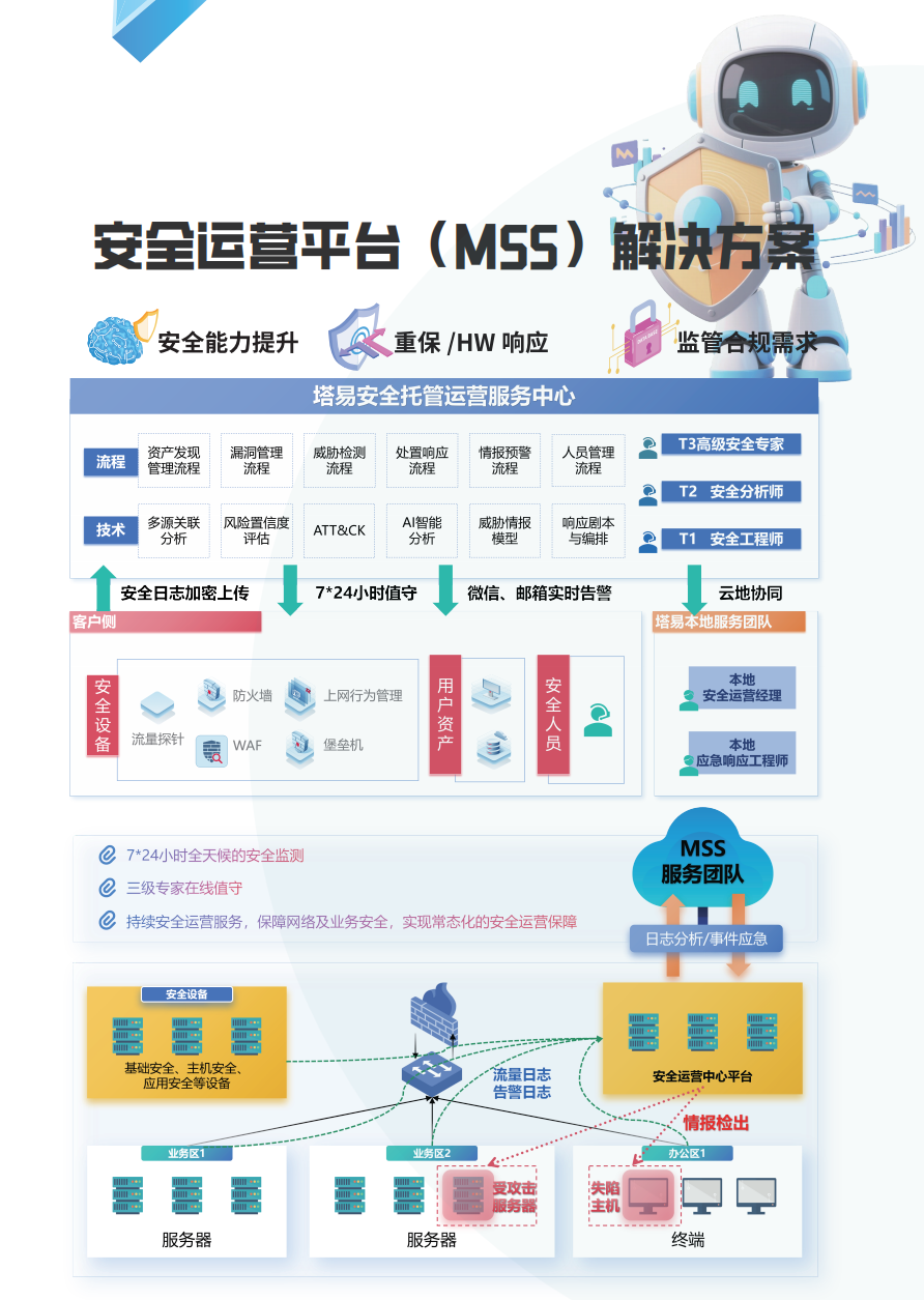安全运营平台(MSS)解决方案:创新采用“云端AI分析+本地专家团队”协同模式,7×24小时保障威胁监测、漏洞管理与闭环响应。实践证明,该服务可帮助客户降低安全运营成本50%,同时显著提升整体网络安全防护水位。