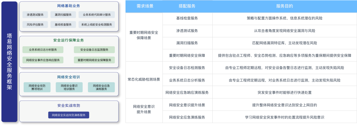 塔易技术深耕网络安全服务多年,能够为客户提供以安全基础服务、安全运行保障服务、网络安全培训、安全实战攻防四大类为基础的网络安全服务。